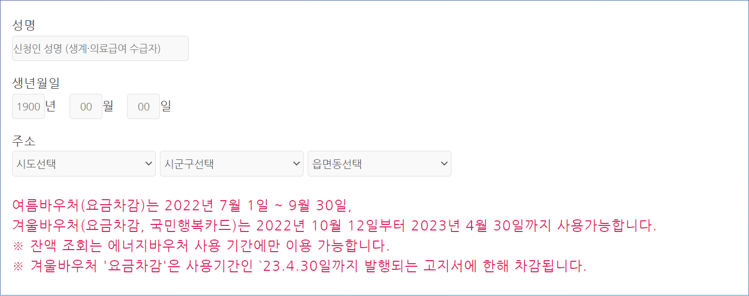 | 겨울바우처 | 2023년 10월 11일~2024년 4월 30일 | 요금차감: 전기, 도시가스, 지역난방 중 1개 |